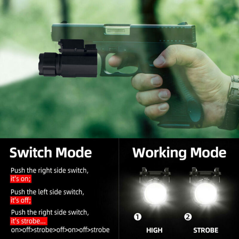 The tactical flashlight equipped with XP-G2 R5 LED, its beam distance can be up to 200 meters. With 2 lighting modes, high and strobe mode, the handgun light is suitable for night fishing, camping, hiking, airsoft, hunting, cycling, rock climbing.