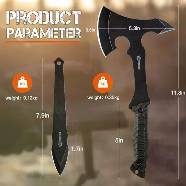 Throwing Axe Knife Set is built for accuracy, durability, and a superior throwing experience. Whether you're honing your skills in target practice, competing, or simply enjoying outdoor activities, this set offers unmatched balance and control. Each axe is crafted from high-quality steel to maintain stability in flight, ensuring consistent performance with every throw. Designed for military personnel, survivalists, outdoor enthusiasts, airsoft game players, mask gear players, and police, this set is perfect for those who demand precision and reliability in their gear.