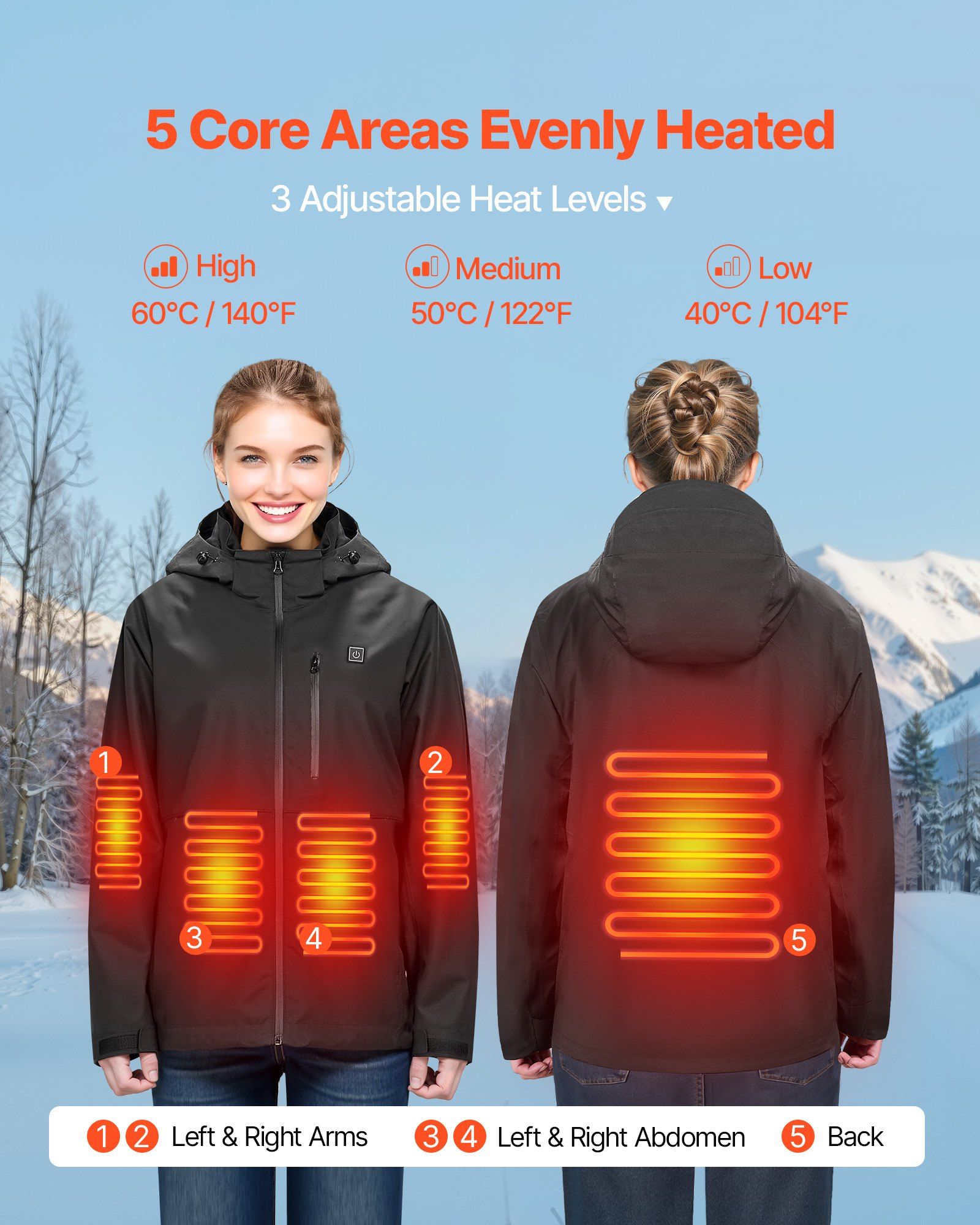 1.Multi-Zone Heating: This heated jacket features carbon fiber elements across 5 core zones (arms, abdomen, back), delivering fast warmth with 3 adjustable heat settings (low/medium/high), 104-140°F, ideal for cold winter days